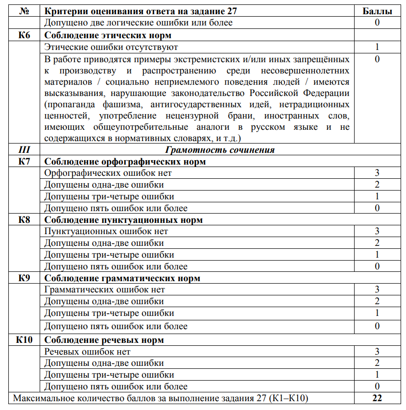 При оценке грамотности (К7–К10) следует учитывать объём сочинения1. Указанные